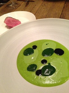 2013年に都内で頂いた料理をここに並べてみると、羊の付け合せのサルサヴェルデ的ソースや、鰤の赤にセロリの白にナスタチウムの緑のような、”色合いが美しければ味も決まる”をこのときも体現していることがわかる。